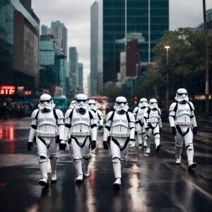 «Storm troopers walking down a city road»
