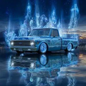 «A classic chrome blue paisley print C10 truck with custom rim...»