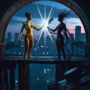 «In a sunlit nebula, a solarpunk envisioned drifter floats amidst...»