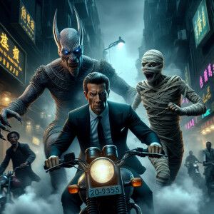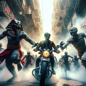 «Hyper-realistic image, wide angle, Anubis and a mummy, with angr...»