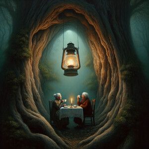 «Two elderly ladies sitting at a table in the hollow of a giant t...»