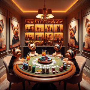 «In a soft-lit room, four yorkies sat around a round poker table,...»