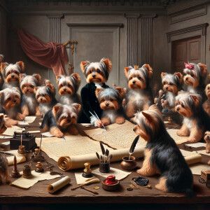 «Create a realistic scene of a bunch of Yorkies around the table...»