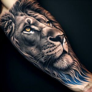 «Create a lion tattoo on arm hyperealisc in detail»