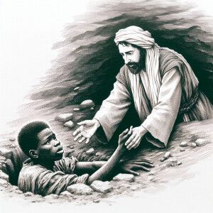 «Jesus Christ extends his hand to a young man who is drawning in...»