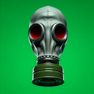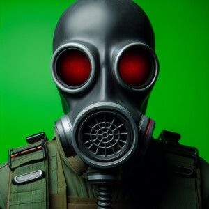 «A singular gas mask with red eyes with a greenscreen behind it»