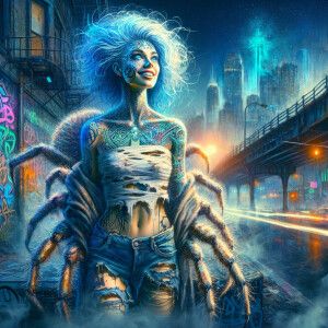 «full-body tarantula with woman's head blue hair blue-haired city...»