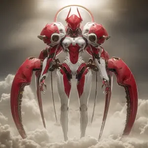 «A powerful, stylized figure, humanoid but with bio-mechanical ex...»