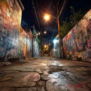 «A graffiti-covered alley in Los Angeles, California, illuminated...»