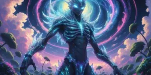 «Amid swirling kaleidoscopic skies and pulsating neon flora, a to...»