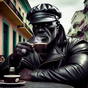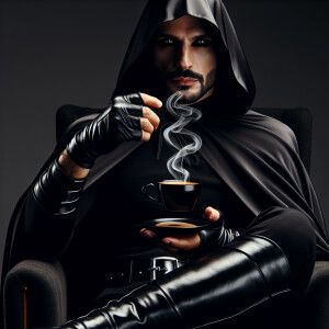 «Персонаж из мемов в кожаной кепке- Чёрный Властелин пьёт кофе Ку...»
