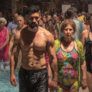 «oil painting,a muscular beefy kashmiri son in law walking ,with...»