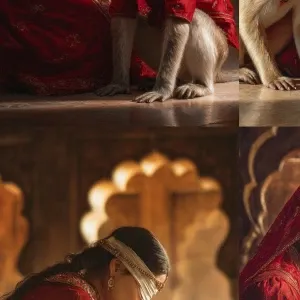 «A traditional Indian woman in a red saree lovingly tying a white...»