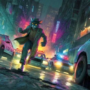 «Humanoid gangster cats sprinting through a neon-lit alley at nig...»