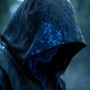 «A cinematic close-up portrait of an enigmatic sci-fi figure wear...»