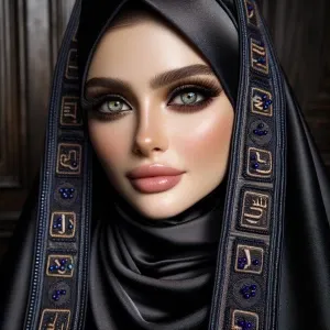 «Beautiful woman with round face, white skin, wide, dark olive co...»
