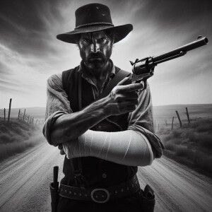 «A old west gunslinger with one arm in a cast down by his side, f...»