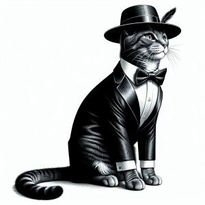 «cat in a tuxedo, fedora hat, rose in pocket, art»