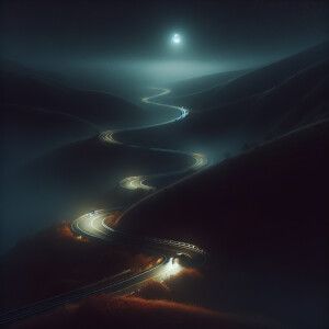 «Autumn. Night. Serpentine. A car is driving in the fog on the ro...»