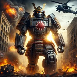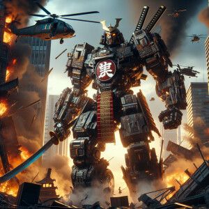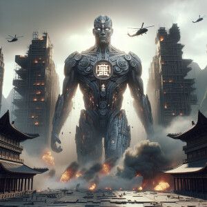 «China as a transformer character, “英雄” embedded on the chest,...»