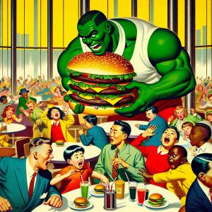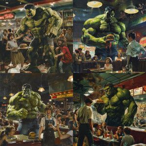 «Hulk scaring off a waiter in a packed diner, with kids screaming...»