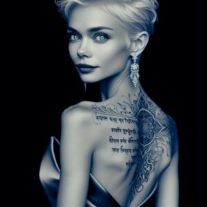 «Platinum blonde Kahlan Amnell, mantra-scripted blue tattoo traci...»