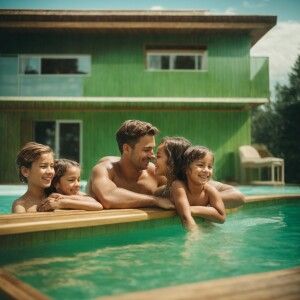 «Family are having fun in the sauna inside building with pool. th...»