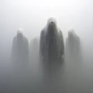 «Create an image of ethereal, human-sized beings, slightly larger...»