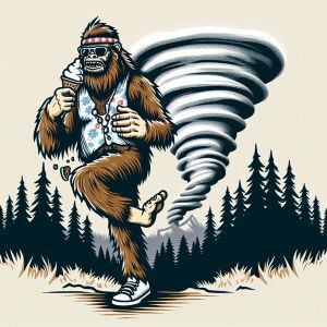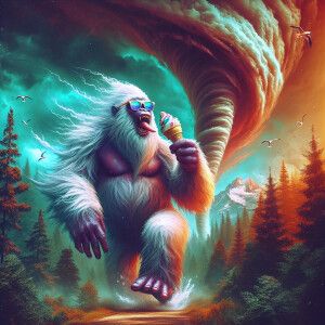 «A hippie Bigfoot eating an ice cream cone in front of a tornado...»
