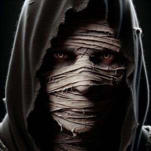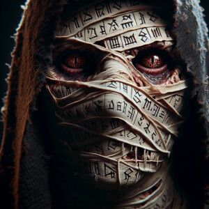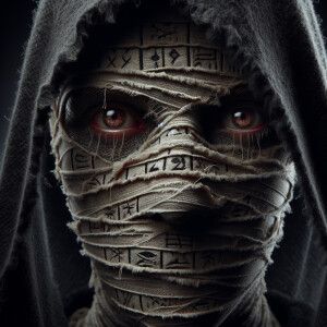 «Create a hyperrealistic and cinematic close-up image of a mummy-...»