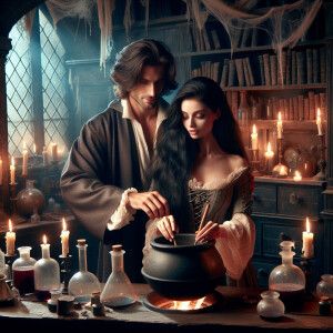 «Severus snape and a beautiful woman making potion, romantic scen...»