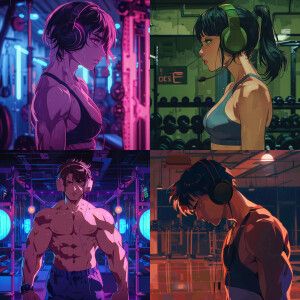 «Anime muscle character, wearing headphones a the gym, phonk cove...»