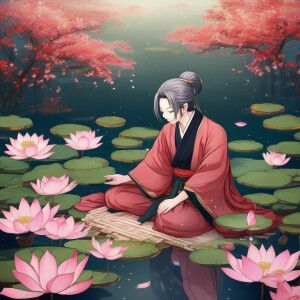 «Kneeling in a lotus pond, lots and lots of lotus flowers»