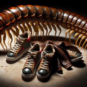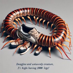 «Whimsical centipede with 1000 legs tennis shoes on each foot and...»