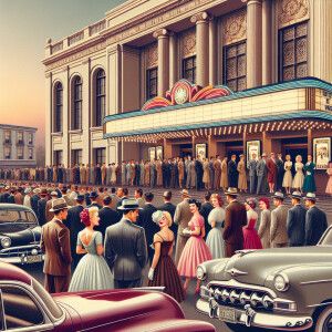 «A scene of a 1950s theater with cars, parked out front and peopl...»