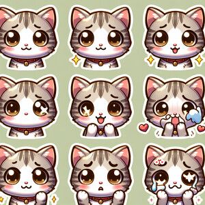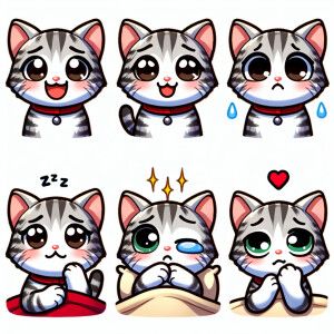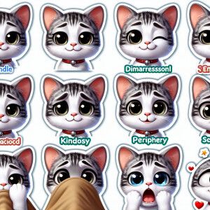 «Create a sticker pack for me featuring a cute gray-and-white kit...»