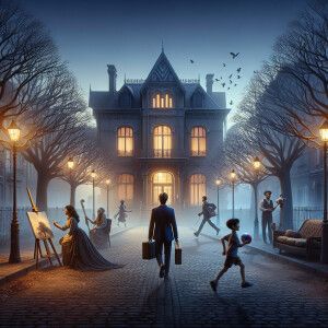 «People walk past an abandoned mansion with no lights on»
