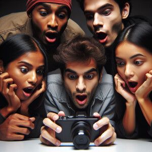 «2 guys and 2 girls are watching the camera footage in surprise»