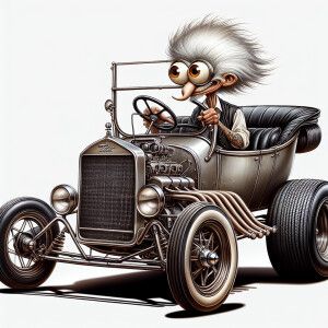 «1923 roadster driven by rat fink, rat fink has hand on tall shif...»