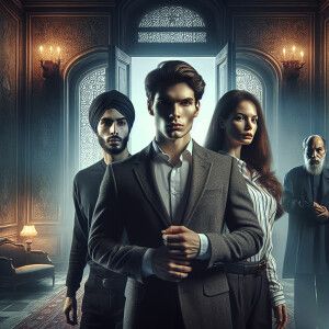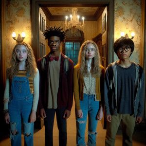 «4 teenagers are standing in an abandoned mansion. There's an ope...»