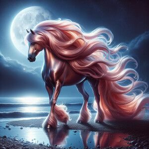 «Prompt: a pinkish golden stallion, wild, majestic, with shiny co...»