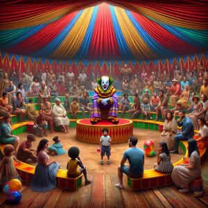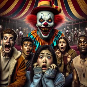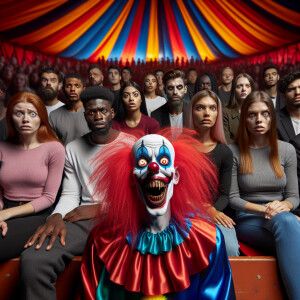 «People are sitting in a circus tent, and there is a scary smilin...»
