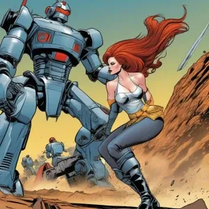 «4 comic panel of a redhead supermodel fighting a giant robot.»