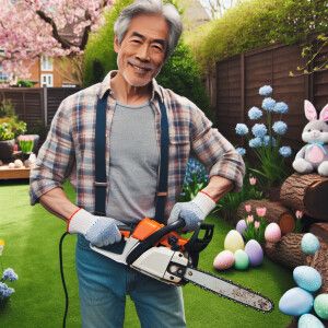 «Grandma with chainsaw easter, On the saw the inscription of the...»