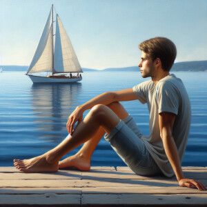 «Realistic, oil painting Of a young man Sitting on a dock, Man is...»