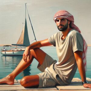 «Realistic, oil painting Of a smooth skinned man Sitting on a doc...»