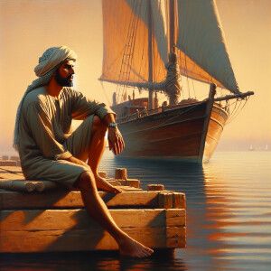 «Realistic, oil painting Of a man Sitting on a dock, Man is weari...»