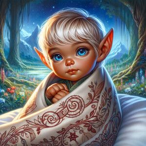 «An elven baby with dark brown skin, blue eyes, and light blonde...»