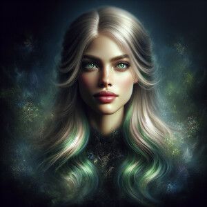 «Head shot of a beautiful woman with bright green eyes and long b...»