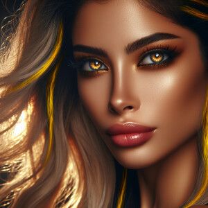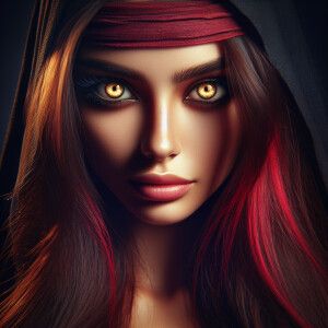 «Head shot of a beautiful woman with bright golden eyes and long...»